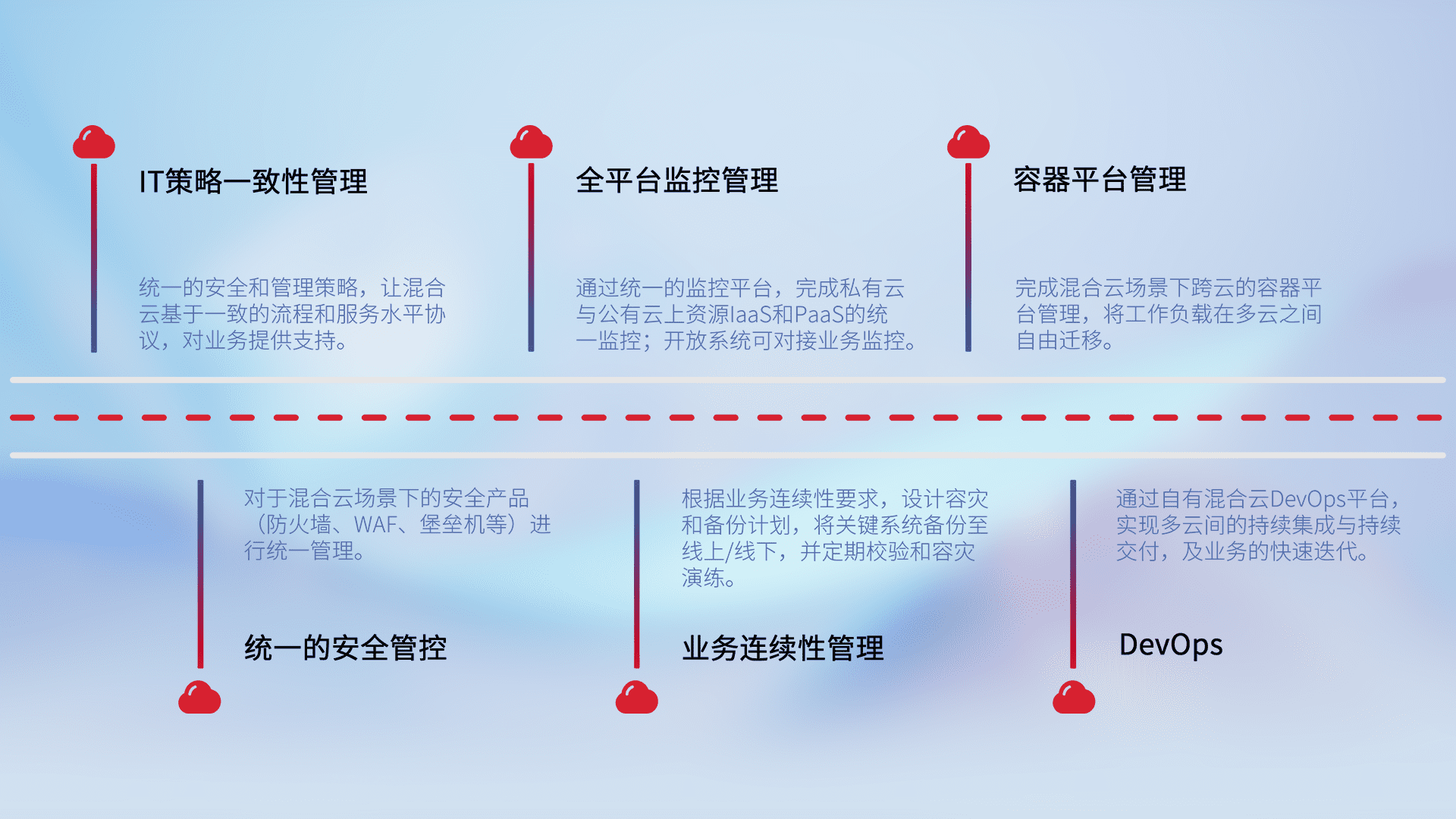 通过多云纳管,,,以统一的资源数据模型把客户的云资源进行抽象和封装,,,,进而实现对多云资源的统一操作,,,保障云资源管理的可靠性、、、、稳定性与可用性。。。量身定制化运维内容,,,配置、、开发运维、、、补丁管理、、、、备份、、、监控、、认证和访问管理、、、、审计和日常巡检等,,,保障在用云过程中的可靠度,,稳定度以及高可用率。。